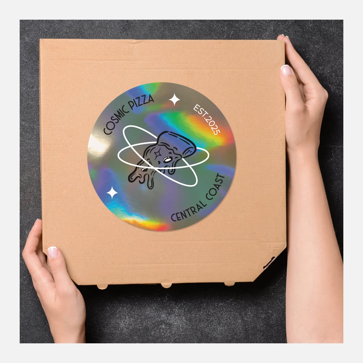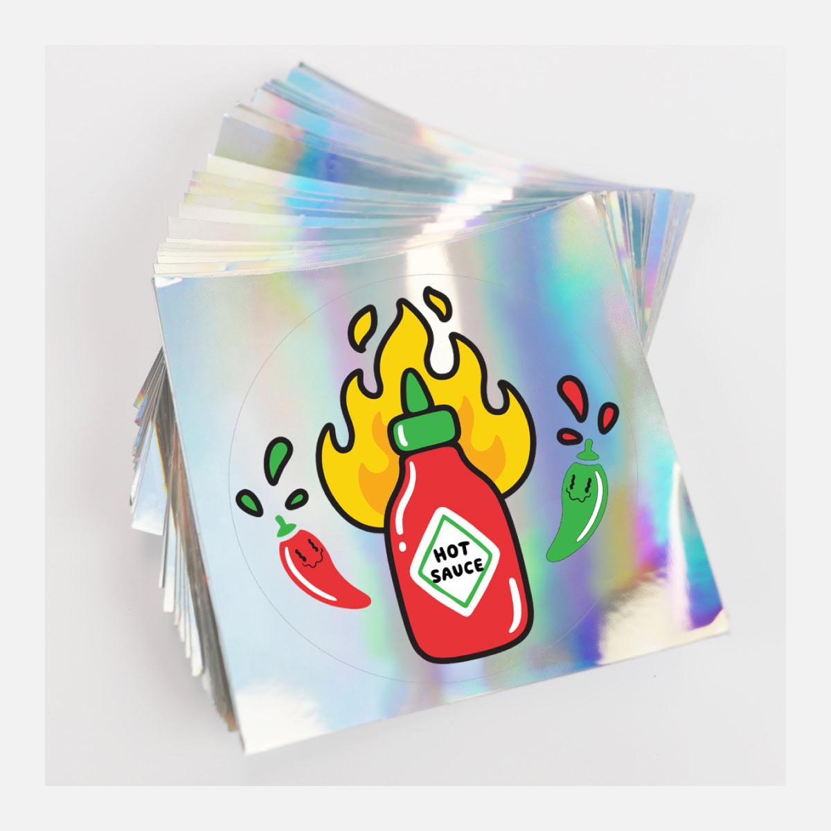 Printed in full colour (+ white optional) with uv stable inks on long lasting holographic vinyl. These stickers are perfect for outdoor applications and are supplied as singles with an easy to remove outer peel tab.
